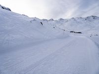 A line of tourists skiing down a snowy piste in the Massif des Écrins, a mountain range in the French Alps, on a clear winter day. The Nunatak glacier can be seen in the background, atop a steep terrain of ice caps, cliffs, and glacial valleys.