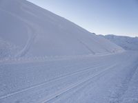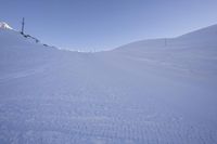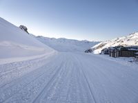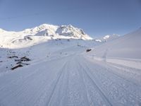 A beautiful winter day in the French Alps, with a clear blue sky and snow-capped peaks. A ski slope carved into the mountain range provides a great recreational surface for tourists to enjoy the majestic mountain landforms and glacial valleys. A low-lying contrail can be seen straight down the road.