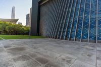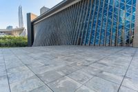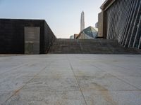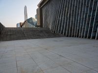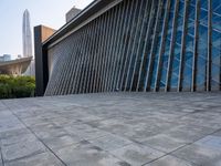A modern cityscape of Shenzhen, Guangdong, China, featuring futuristic architecture with open spaces, pavers, and a museum. This urban design provides a unique profile of the city on a clear day.
