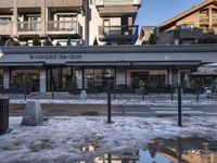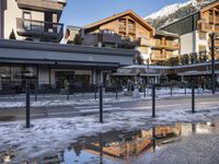 A neighborhood of mixed-use buildings, houses, and hotels in Chamonix, France is seen on a winter day, with snow covering the road and roofs. A tourist attraction in the French Alps, Chamonix is a popular destination for skiing, tourism, and eating out in the European winter months.