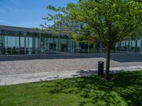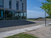 Located in the heart of Spain's business district, this modern glass-walled office building stands tall against the clear blue sky. The sleek architecture and reflective surfaces create a stunning contrast with the surrounding concrete and gravel areas. Shadows cast by the midday sun add depth and dimension to the urban landscape. The combination of glass walls and hard shadows give the building a contemporary and dynamic look. It's a perfect example of modern architecture in a bustling business district.