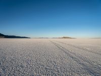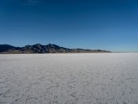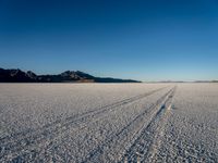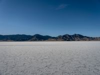 The Bonneville Speedway in Utah, USA is illuminated by the sunny sky and the Salt Lake surface. The desert landscape, mountains, and sand are visible as the track is left with a motion blur from the contrails of the day.