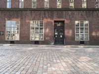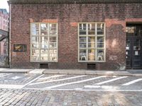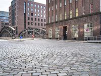 A view of Speicherstadt, Hamburg, Germany, with classic architecture, urban design, and cobblestone roads. Buildings, windows, brick walls, and trees are visible in the clear sky of the day. The city provides a picturesque backdrop of infrastructure, asphalt roads, and flooring.