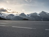 empty road surrounded by large mountains under cloudy skies over them and the snow covered peaks above