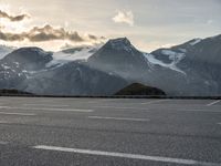 a motorcycle is parked in the middle of a mountainous road in front of snow capped mountains