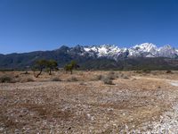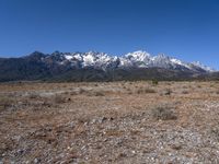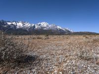 A view of the historic village of Lijiang, China, nestled between the majestic alps in the Yunnan Province of Shangri-La. The area is known for its stunning natural environment, from the grassy plains to the snow-capped mountain range. The dirt road leads off to the wildness of the vast open space.