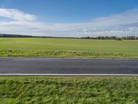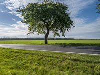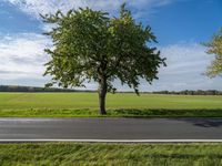 A scenic view of a rural area in Berlin, Germany featuring a road surface with lush vegetation, a field of autumn vegetation, a green landscape with a tree, a windmill, and a clear sky. Europe's natural beauty is illuminated by the sunlight.