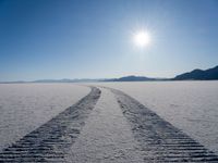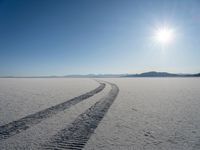 a truck tracks in a vast desert with mountains in the distance and a blue sky