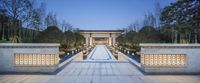 A view of a straight road in Chongqing, China, with residential buildings, trees, and clear sky in the background.