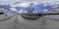 A view of a straight road in the city, with buildings and parking lots on both sides, under a cloudy sky.
