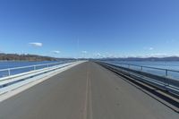 A scenic view of a straight road surface leading towards the horizon, with a line of street lights and an Armco barrier. The road runs parallel to a beautiful azure lake, with a bridge crossing over it. The landscape is surrounded by a coastal area, with a fence and guard rails along the road. The sky is filled with fluffy white clouds, adding to the serene atmosphere.
