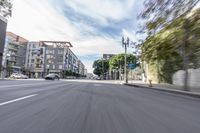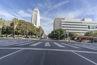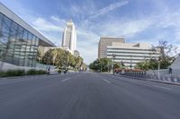A view of the asphalt road in Los Angeles, California, USA, with the cityscape and high-rise buildings in the background. The motion blur of passing vehicles adds a sense of speed and urban energy to the scene.
