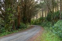 A sunny day in New Zealand with a straight road leading through a beautiful forest of trees. The gravel road is surrounded by lush green grass and dirt, with the bright sun visible overhead. The low angle of the photo captures the scenic view of the road stretching into the distance, inviting exploration.