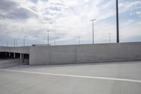 a paved parking lot with several street lights and a concrete wall against a blue sky