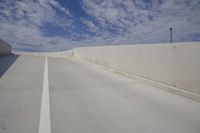 A view of a straight road in a residential area, with asphalt surface and grey concrete street. The road stretches towards the horizon with plain landscape on both sides. The parallel lines of the road create a sense of depth. The cloudy sky casts a soft shadow on the road, while street lights illuminate the land lot and vegetation along the thoroughfare. The architecture of the buildings adds to the profile of the scene.