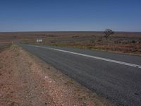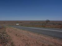 a deserted highway in the middle of a desert landscape in australia, with a lone sign on one side and some grass and scrub land