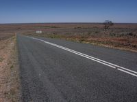 a long empty road stretches along a wide plain and it is paved with a white sign