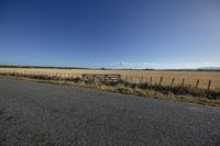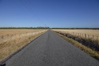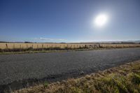A sunny day on a rural road surrounded by fields and vegetation, with a clear sky and the sun visible on the horizon.