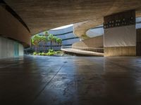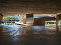 A view of the straight road in a Spanish city, with low concrete buildings and asphalt road surface. The open space plaza in the foreground is made of composite material flooring, surrounded by vegetation casting shadows. The urban design of the city showcases symmetrical architecture and a grey surface, creating a hard shadow effect. This photo captures the unique blend of European urban design and the vibrant atmosphere of Tenerife, Canary Islands.