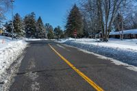 a street that has a yellow line on it next to trees and snow covered sidewalks