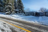 the street is filled with snow by some evergreen trees and shrubs on a sunny day