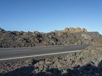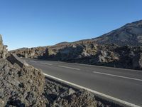 A scenic view of a straight road cutting through the volcanic landscape of Tenerife, Spain. The road surface, made of asphalt and tar, leads through a low-lying valley surrounded by majestic mountains. The clear sky above highlights the brown terrain and vegetation, creating a serene and picturesque rural scene in this European island.