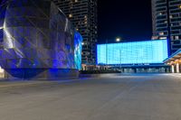 blue and silver building sitting next to an empty street at night time near other large buildings