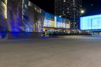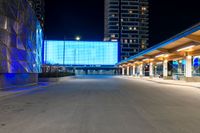a paved street in front of a building with a blue glass wall above it at night