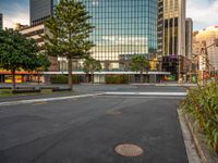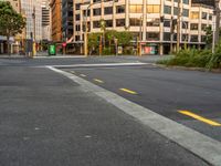 A view of a straight road with asphalt and a crosswalk in Wellington, New Zealand. The road leads to a bustling business district with modern architecture and glass-walled office buildings and storefronts. The dawn breaks over the city, casting a soft light on the busy traffic and shopping scene.