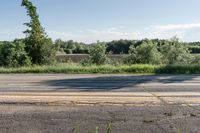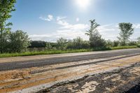 A scenic view of a straight road in Ontario, Canada, surrounded by lush green grass and trees under a clear blue sky.