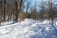 A straight road in rural Ontario, Canada, with snow-covered surroundings and a hard shadow cast by the bright sun on a sunny day.