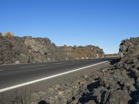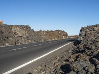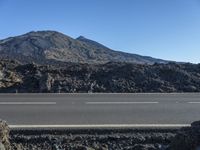 A straight road with bedrock and asphalt surface cuts through the rugged mountain range in Tenerife, Spain. The low vegetation and clear sky create a picturesque rural landscape in this European national park.