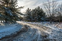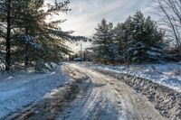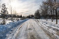 A straight road in a suburban area of Toronto, Canada, covered in a thick layer of snow on a sunny winter morning.