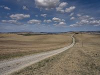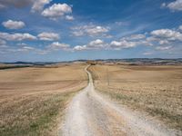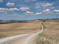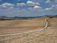 A rugged road winds through the natural environment of Tuscany, Italy. The horizon is filled with a grass surface dotted with gravel and dirt, and clear sky stretches out above a field of harvest and gardens. This is a view of the rural prairie, plain, and steppe terrain.