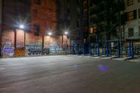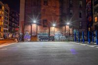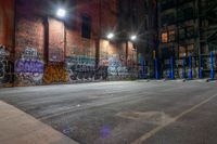 A brick wall in Manhattan, New York City, covered in graffiti and street art, illuminated by a street light at night. The contrast between light and dark asphalt surfaces, and brick walls, is a hallmark of urban design in the USA.