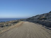 A beautiful sky overhead and a coastal road lined with trees and vegetation. The azure water and sand on Portugal's shore can be seen in the distance, and the mountain landforms in the horizon make for a stunning natural environment.