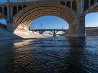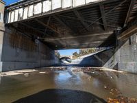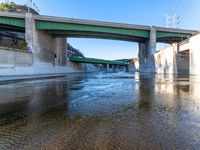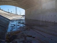 View of a residential area in the city of Los Angeles, California, USA. The scene features a concrete bridge, underpass, building, road, tree, river, road surface, lake and water resources. The clear sky is filled with a hard shadow cast by the concrete bridge and street light. The aqueduct, arch bridge, composite material, arch, wall, brickwork, infrastructure, cloud, tunnel, tar, thoroughfare, naval architecture, line, and canal create a symmetry in the scene.