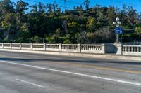 A residential street in the suburbs of Los Angeles, California with asphalt road surface, overhead power lines, traffic light, bridge, split-rail fence, street light, and mountain landscape in the background. Clear sky and vegetation on both sides of the road.
