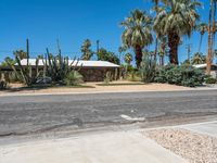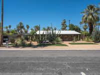 A low profile modern architecture villa in Palm Springs, California stands surrounded by an asphalt driveway, gravel parking lot, and dirt path, all beneath a clear blue sky.