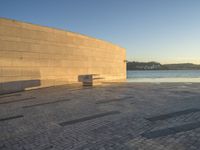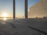 A calm atmosphere in the city of Lisbon, Portugal, at the break of day with sun visible on the horizon. The azure sky is visible through the modern architecture, while the coastal landscape offers a composite material of cobble stone, wood, asphalt, and brick. The sun is slowly rising, casting light and hard shadows on the floor and creating tints and shades of the urban environment.