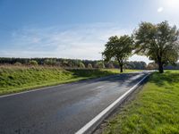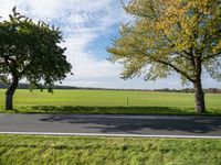 A peaceful autumn day in Berlin, Germany offering a stunning rural landscape with a clear sky, lush vegetation, and a road surface with asphalt, grass, and tar. The sunlight reflects off the bicycle wheel and helmet, and a woody plant with yellow leaves stands in the background.