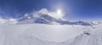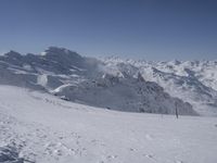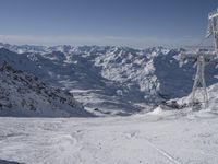 A tourist enjoys the view of the alpine landscape on a sunny day in the French Alps. The mountain range boasts many snow-capped peaks, glacial valleys, and ski slopes with a gondola providing an overlook of the terrain. Nunataks, arêtes, and low profiles are just a few of the mountain landforms that make this area a popular tourist attraction.