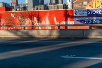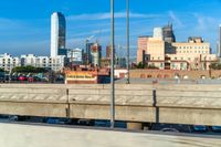 A view of the Los Angeles skyline illuminated by the morning sun, with a split-rail fence, Armco barrier, and a traffic sign providing a sense of safety and security in the modern urban environment.