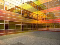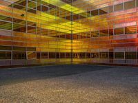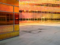 A mixed-use building in the Netherlands with a clear sky and a beautiful sun visible. The building's facade features an orange, brickwork pattern with metal fixtures, providing a unique and modern architecture to the area.
