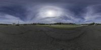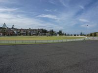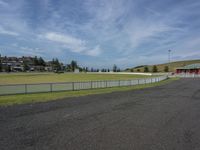 A scenic view of an asphalt road surrounded by lush green grass and trees in a park on a sunny day.