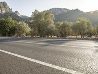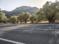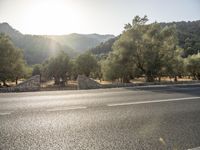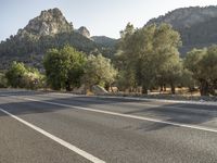 A beautiful sunny day in Mallorca, part of the Balearic Islands in Spain. The yellow lane winds through the natural environment of the area, featuring a mix of road surfaces, trees, and mountain landforms. The clear blue sky and sunshine make for a perfect day to explore the European wilderness.