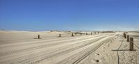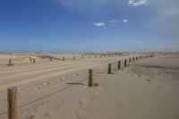 an empty road surrounded by sand dunes and fences in the desert area, with blue sky in the background