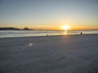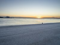a man riding a skateboard across a sandy beach near the ocean at sunset time