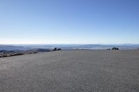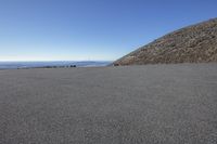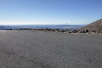 a long empty road with rocks and mountains in the distance in front of it and blue skies above