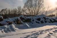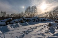 A scenic view of a residential suburban area in Toronto, Canada, with a straight road covered in snow, surrounded by trees, and the sun visible on a sunny day at dawn.